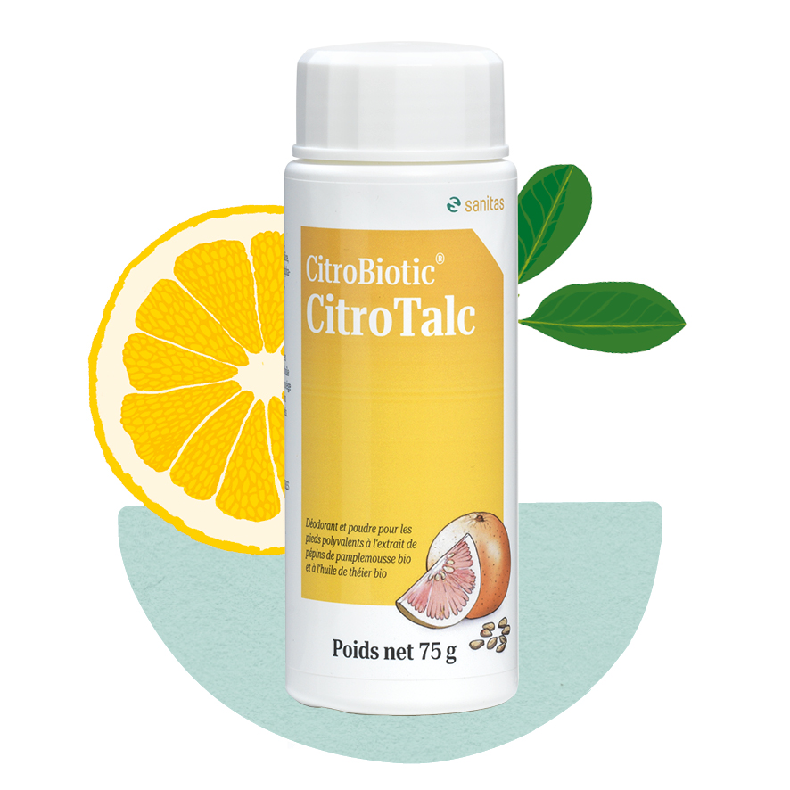 CitroBiotic CitroTalc est un talc à l’extrait de pépins de pamplemousse bio et à l’huile de mélaleuca bio. Ce talc pour pieds absorbe la transpiration et neutralise les mauvaises odeurs.