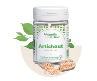 Composition pour 2 gélules : Artichaut BIO (cynara scolymus) : 400 mg Extrait sec de feuilles d’artichaut issu de l’agriculture biologique, titré à 2,5% en cynarine. Dosage : 400 mg, Saccharose BIO (agent de charge),Gélule végétale (Hydroxypropylméthylcellulose) (tunique) ,Hypromellose (agent agglomérant)