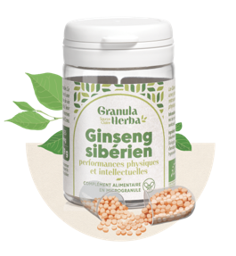 Le Ginseng Sibérien est une plante adaptogène qui Contribue à améliorer les performances physiques et intellectuelles. Complément alimentaire en gélules contenant des microgranules