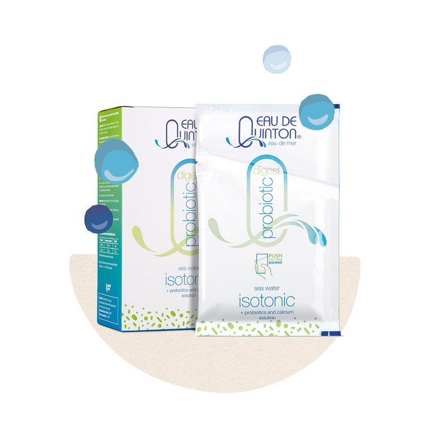 25 ml de solution isotonique à base d'eau de mer et 800 mg de mélange de probiotiques et de calcium.